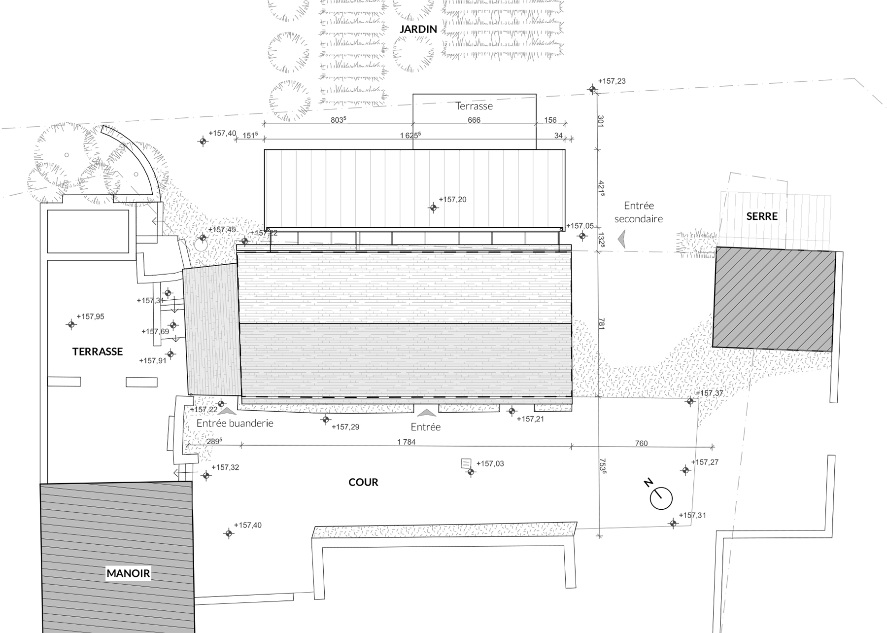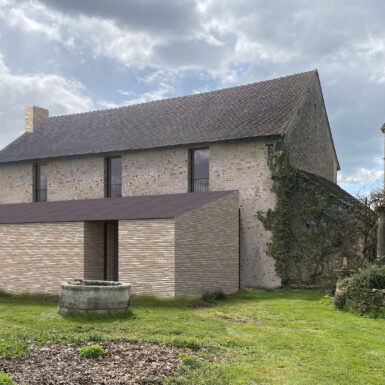 Le chemin emprunté pour la construction de l’extension est celui d’une ligne de crête : un épais manteau de briques joue la carte de la massivité, tandis que la toiture en cuivre dessine une rive fine comme une lame. Une baie horizontale offrant une vue panoramique sur le parc cohabite avec des ouvertures en plein cintre. Les mêmes matériaux sont utilisés dans des mises en oeuvre différentes, contemporaine dans l’extension, vernaculaires dans la partie existante.