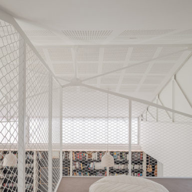 L’une des difficultés du projet est de gérer astucieusement l’étirement de la maison dans la profondeur de la parcelle qui nécessite de parcourir une vingtaine de mètres avant d’atteindre le séjour. Ce cheminement est aménagé en une succession de séquences architecturales variées tant dans les usages que dans les ambiances, comme une promenade qui conduirait de la courette avec ses parapluies suspendus jusqu’au fond du jardin en passant par le bureau (boîte noire surbaissée cadrant sur le patio), le séjour (grand volume) puis la serre (jardin d’hiver ouvrable sur le jardin).